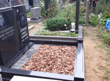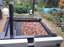 Возвращаем надгробья на место, укрепив подставку двумя рядами брусчатки. По периметру участка ставим гранитный цоколь, в качестве наземного покрытия остальной территории используем кору.